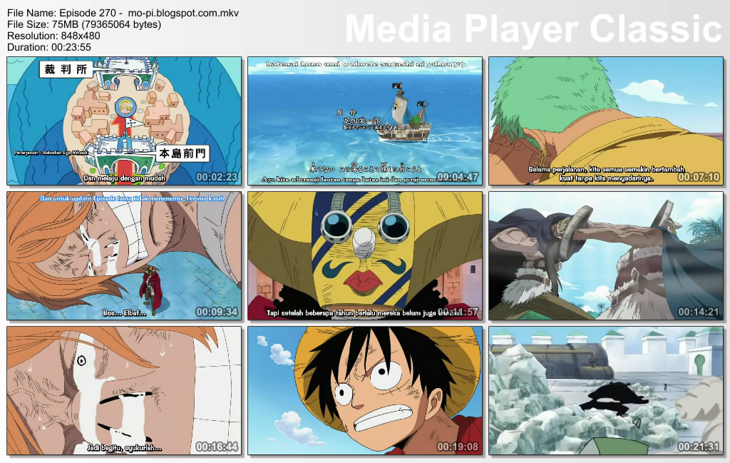 Pada Film One Piece Episode 270 (Kembalikan Robin! Luffy vs Blueno!) Bahasa Indonesia ini, akhirnya, para penyusup mampu dikalahkan satu per satu, dan perjalanan Topi Jeramipun akhirnya menjadi sulit untuk mencapai Gedung Pengadilan, sedangkan itu, Luffy yang sejak tadi bertarung habis-habisan akhirnya dia sampai diatap gedung pengadilan, dan akhirnya disana munculan Blueno salah satu dari anggota CP9, dan akhirnya pertarungan antara Luffy dan Blueno Tak terelakan, bagaimanakah kisah selanjutnya?